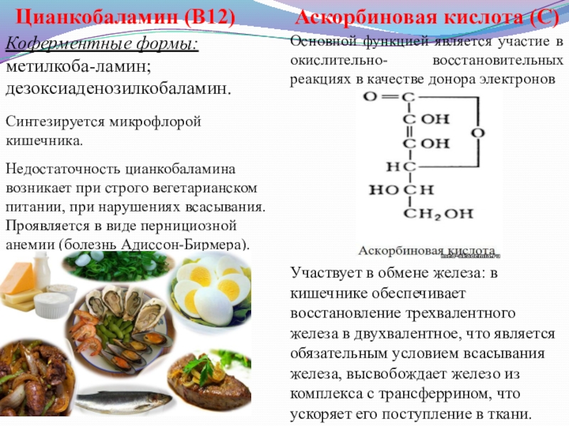 Участвует в обмене железа: в кишечнике обеспечивает восстановление трехвалентного железа в двухвалентное, что является обязательным условием всасывания железа, высвобождает железо из комплекса с трансферрином, что ускоряет его поступление в ткани.