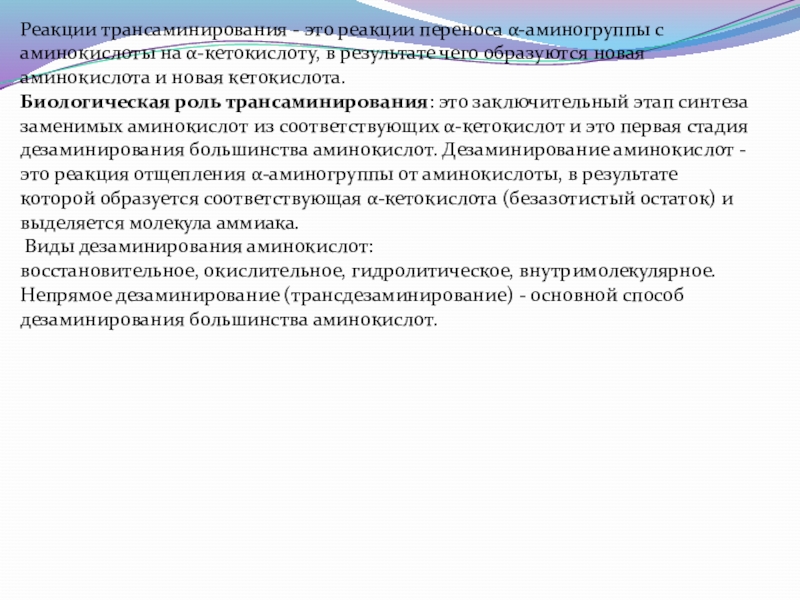 Биологическая роль трансаминирования: это заключительный этап синтеза заменимых аминокислот из соответствующих α-кетокислот и это первая стадия