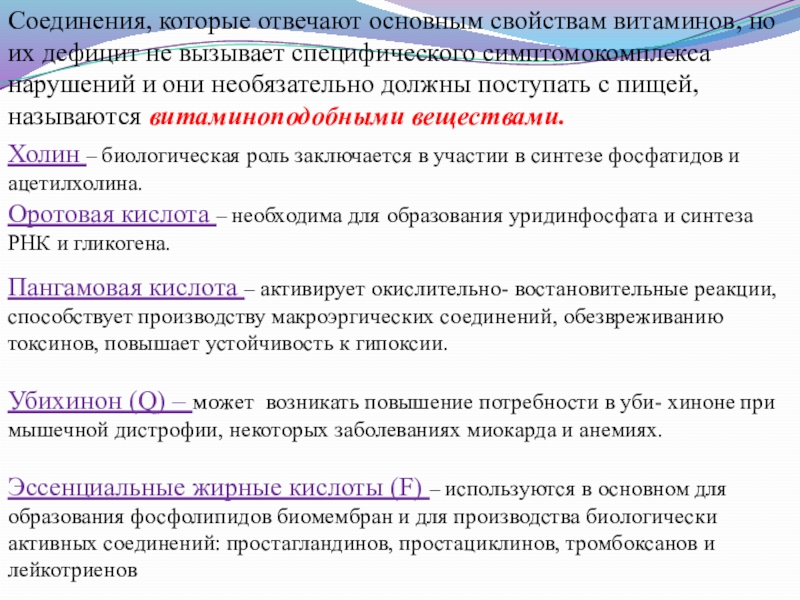 Слайд 12Соединения, которые отвечают основным свойствам витаминов, но их дефицит не вызывает