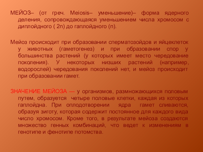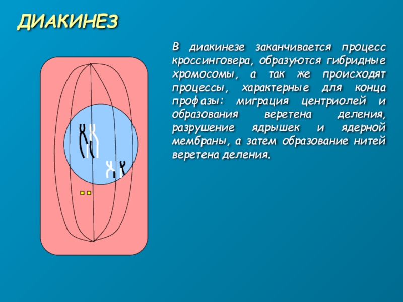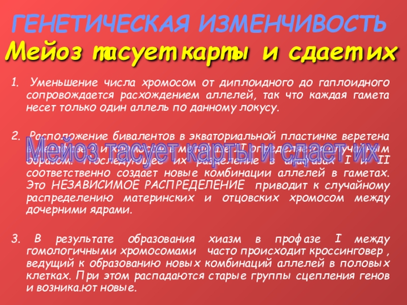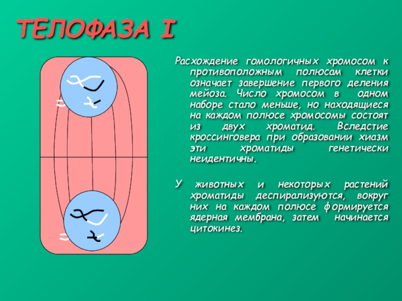 имеющихся в каждой хиазме нитей. В результате гены из одной хромосомы оказываются связанными с генами из другой хромосомы, что приводит к новым генным комбинациям в образующихся хроматидах. Этот процесс называется кроссинговером. Гомологичные хромосомы после кроссиговера не расходятся, так как сестринские хроматиды остаются прочно связанными вплоть до анафазы.