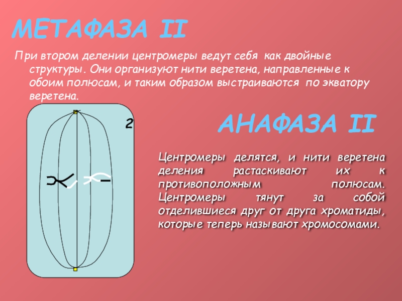 Центромеры делятся, и нити веретена деления растаскивают их к противоположным полюсам. Центромеры тянут за собой отделившиеся друг от друга хроматиды, которые теперь называют хромосомами.