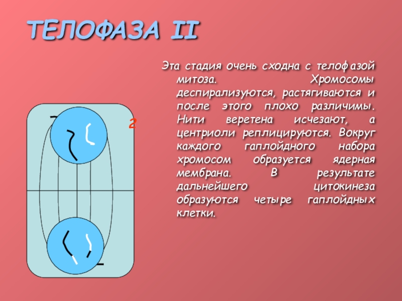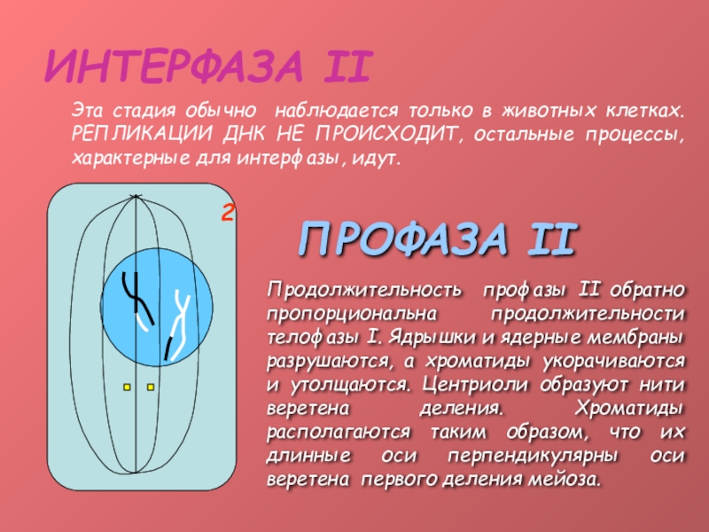 Продолжительность профазы II обратно пропорциональна продолжительности телофазы I. Ядрышки и ядерные мембраны разрушаются, а хроматиды укорачиваются и утолщаются. Центриоли образуют нити веретена деления. Хроматиды располагаются таким образом, что их длинные оси перпендикулярны оси веретена первого деления мейоза.