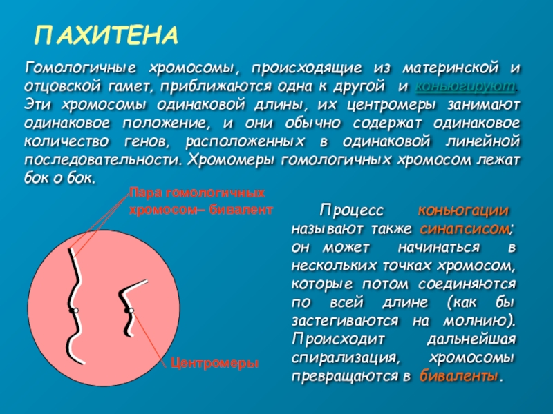 Процесс коньюгации называют также синапсисом; он может начинаться в нескольких точках хромосом, которые потом соединяются по всей длине (как бы застегиваются на молнию). Происходит дальнейшая спирализация, хромосомы превращаются в биваленты.
