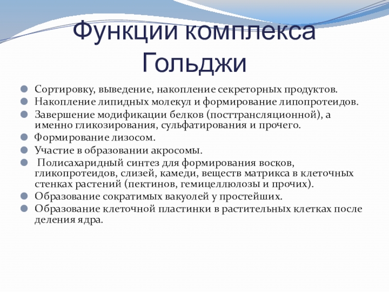 растений, животных и человека. Функции этой составляющей части клетки разнообразны и связаны в основном с синтезом, модификацией и транспортом органических соединений.