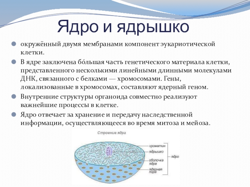 Ядро отвечает за хранение и передачу наследственной информации, осуществляющееся во время митоза и мейоза.