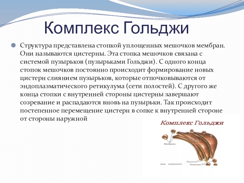 Структура представлена стопкой уплощенных мешочков мембран. Они называются цистерны. Эта