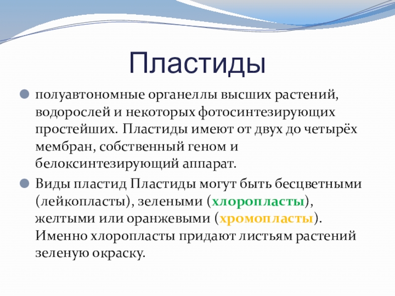 полуавтономные органеллы высших растений, водорослей и некоторых фотосинтезирующих простейших. Пластиды имеют