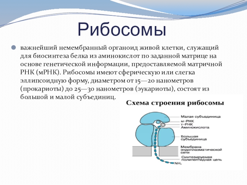 по заданной матрице на основе генетической информации, предоставляемой матричной РНК (мРНК). Рибосомы имеют сферическую или слегка эллипсоидную форму, диаметром от 15—20 нанометров (прокариоты) до 25—30 нанометров (эукариоты), состоят из большой и малой субъединиц.