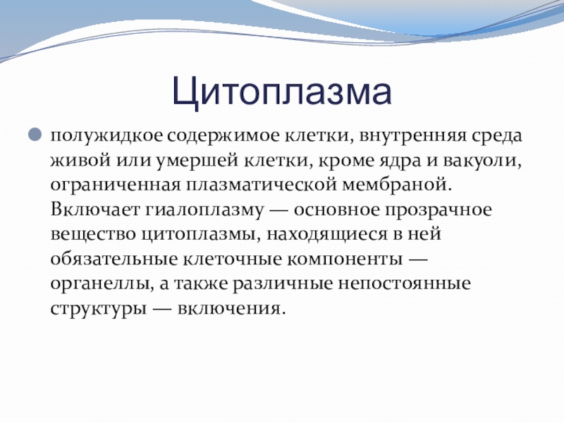 и вакуоли, ограниченная плазматической мембраной. Включает гиалоплазму — основное прозрачное вещество цитоплазмы, находящиеся в ней обязательные клеточные компоненты — органеллы, а также различные непостоянные структуры — включения.