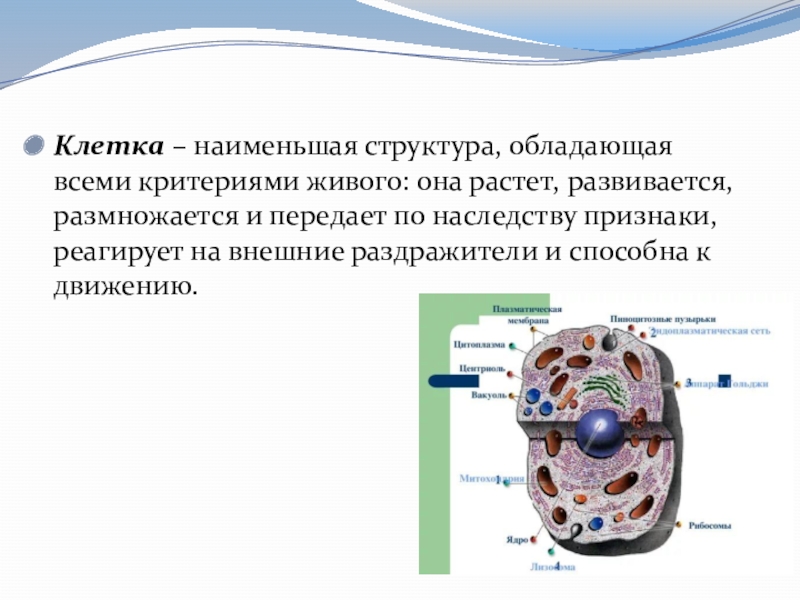 Слайд 2Клетка – наименьшая структура, обладающая всеми критериями живого: она растет, развивается,