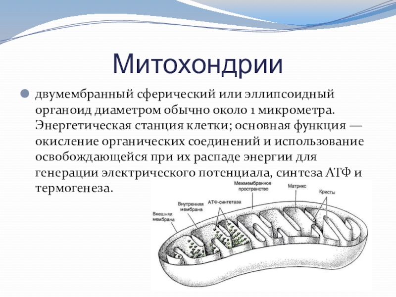 станция клетки; основная функция — окисление органических соединений и использование освобождающейся при их распаде энергии для генерации электрического потенциала, синтеза АТФ и термогенеза.