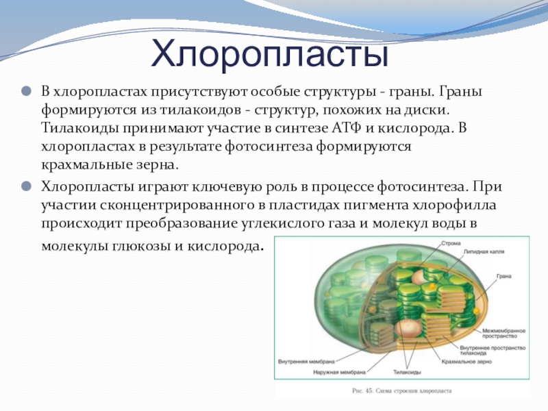 - структур, похожих на диски. Тилакоиды принимают участие в синтезе АТФ и кислорода. В хлоропластах в результате фотосинтеза формируются крахмальные зерна.