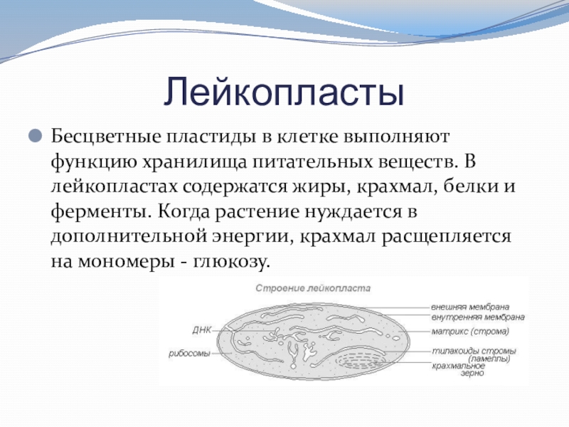 лейкопластах содержатся жиры, крахмал, белки и ферменты. Когда растение нуждается в дополнительной энергии, крахмал расщепляется на мономеры - глюкозу.
