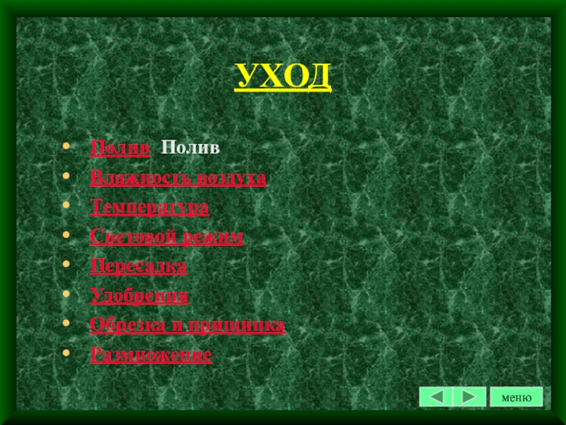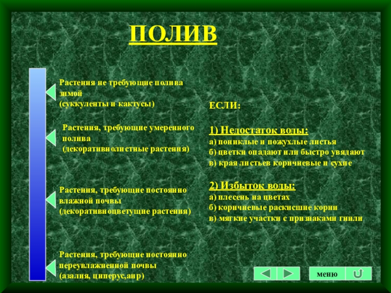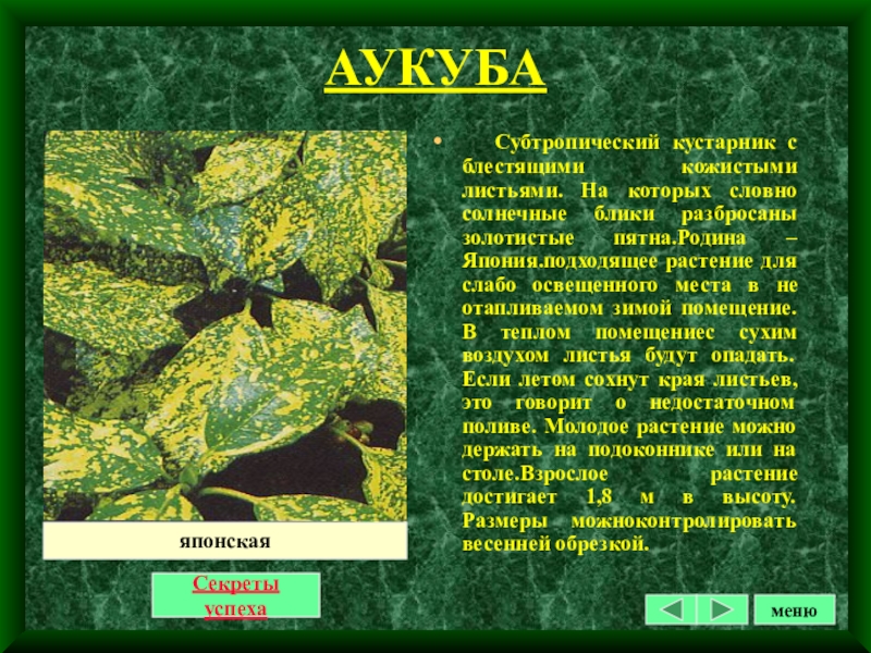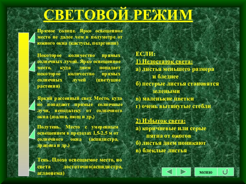 Полутень. Место с умеренным освещением в пределах 1,5-2,5 м от солнечного окна (аспидистра,драцена и др.)