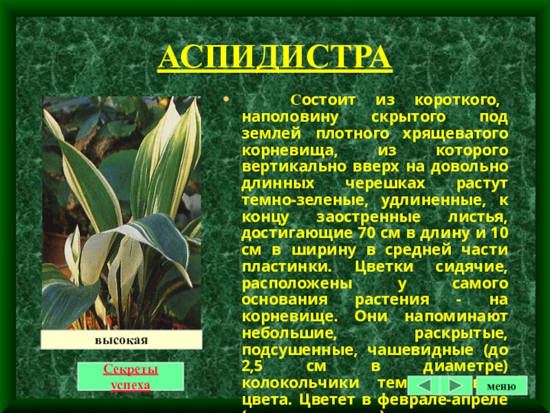 Тень. Плохо освещаемое место, но света достаточно(аспидистра, аглаонема)