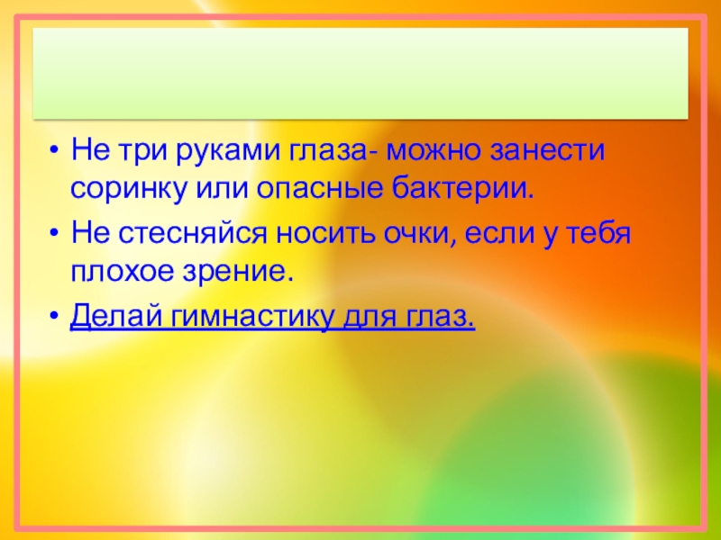 Слайд 14Не три руками глаза- можно занести соринку или опасные бактерии.
