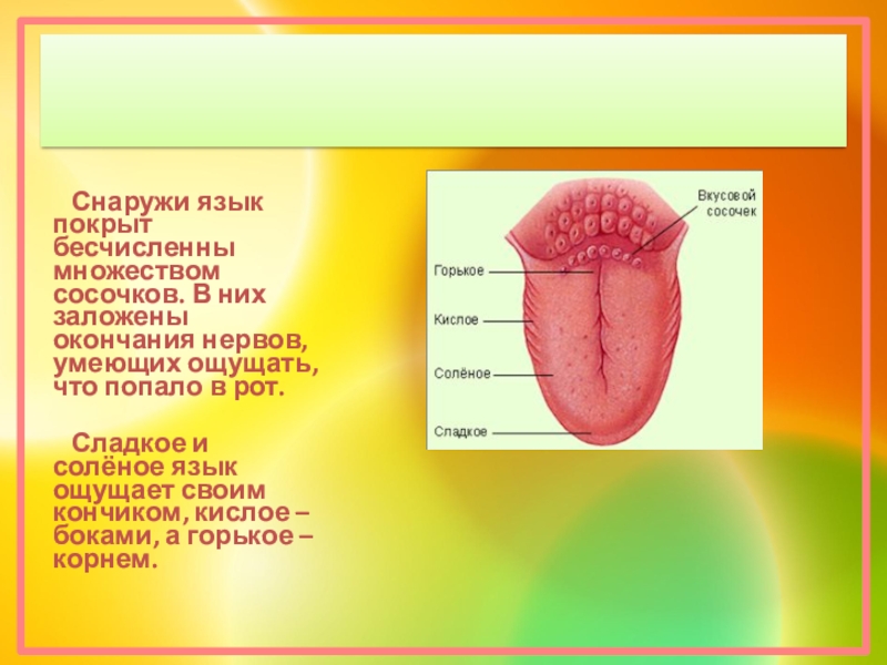 Сладкое и солёное язык ощущает своим кончиком, кислое – боками, а горькое – корнем.