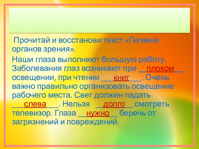 работу. Заболевания глаз возникают при __плохом__ освещении, при чтении ___книг___. Очень важно правильно организовать освещение рабочего места. Свет должен падать ___слева___. Нельзя __долго__ смотреть телевизор. Глаза __нужно__ беречь от загрязнений и повреждений.