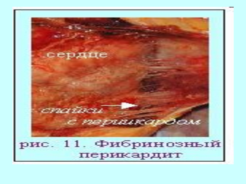 В серозных оболочках фибринозное воспаление приводит к образованию спаек (слипчивый перикардит,