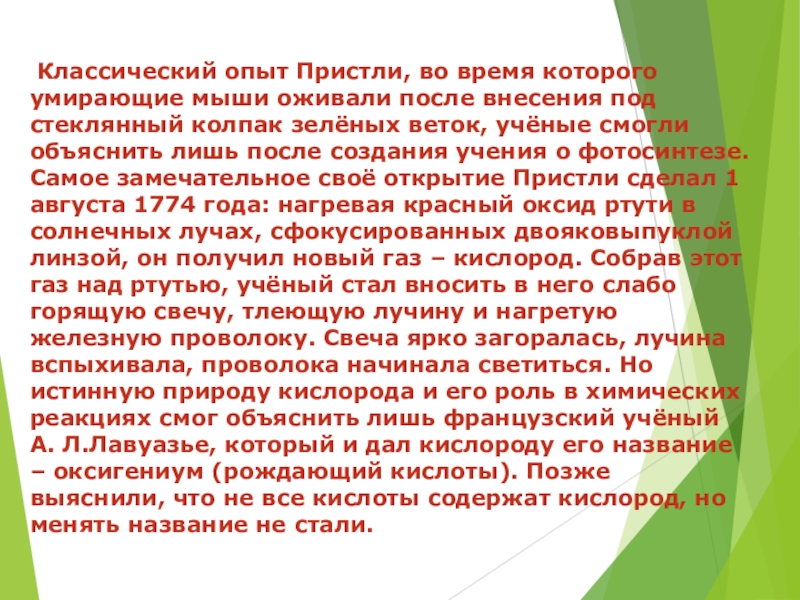 Пристли впервые получил газированную воду. В 1771 году, продолжая изучение «связанного воздуха», Пристли обнаружил, что в присутствии зелёных веток этот газ после пребывания на свету становится пригодным для горения и дыхания.