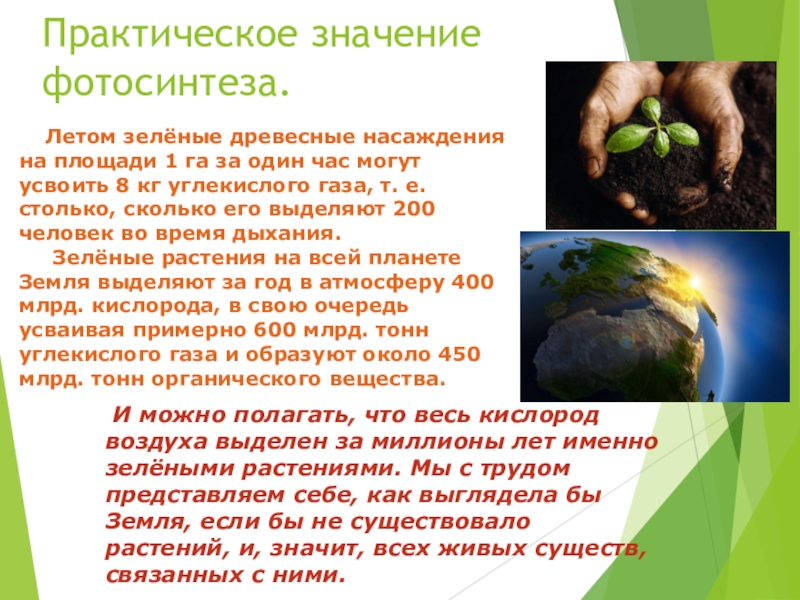 Зелёные растения на всей планете Земля выделяют за год в атмосферу 400 млрд. кислорода, в свою очередь усваивая примерно 600 млрд. тонн углекислого газа и образуют около 450 млрд. тонн органического вещества.