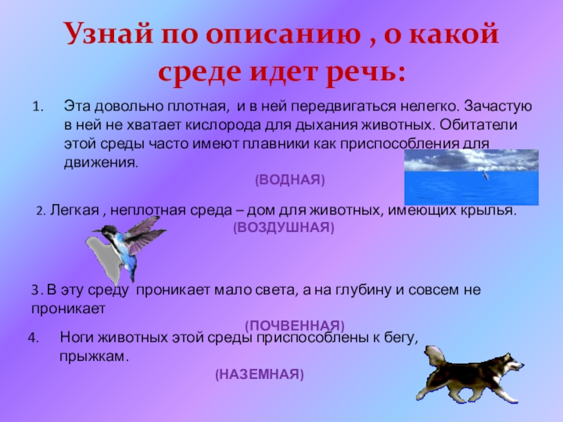 2. Легкая , неплотная среда – дом для животных, имеющих крылья.