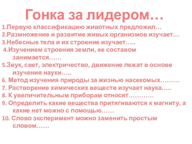 Гонка за лидером…1.Первую классификацию животных предложил…2.Размножение и развитие живых организмов изучает…3.Небесные тела и их строение изучает….. 4.Изучением
