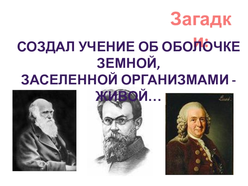 Загадки:Создал учение об оболочке земной,Заселенной организмами - живой…