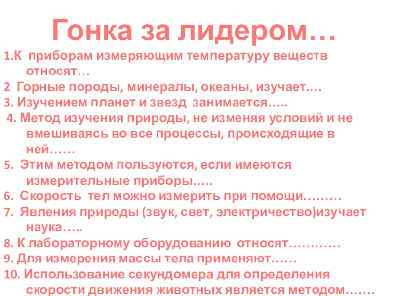 Гонка за лидером…1.К приборам измеряющим температуру веществ относят…2 Горные породы, минералы, океаны, изучает.…3. Изучением планет и звезд