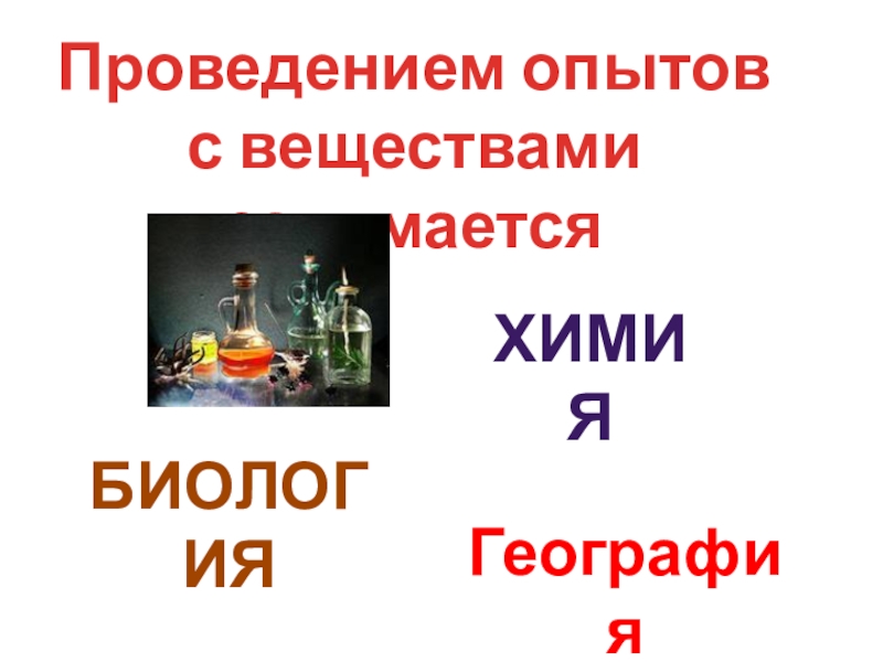 Проведением опытов с веществами занимаетсяхимияБИОЛОГИЯГеография