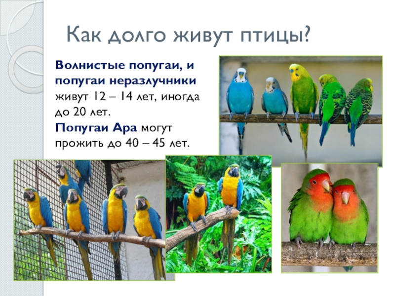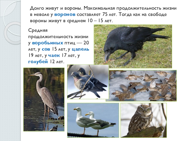 Средняя продолжительность жизни у воробьиных птиц — 20 лет, у сов 15 лет, у цапель 19 лет, у чаек 17 лет, у голубей 12 лет.