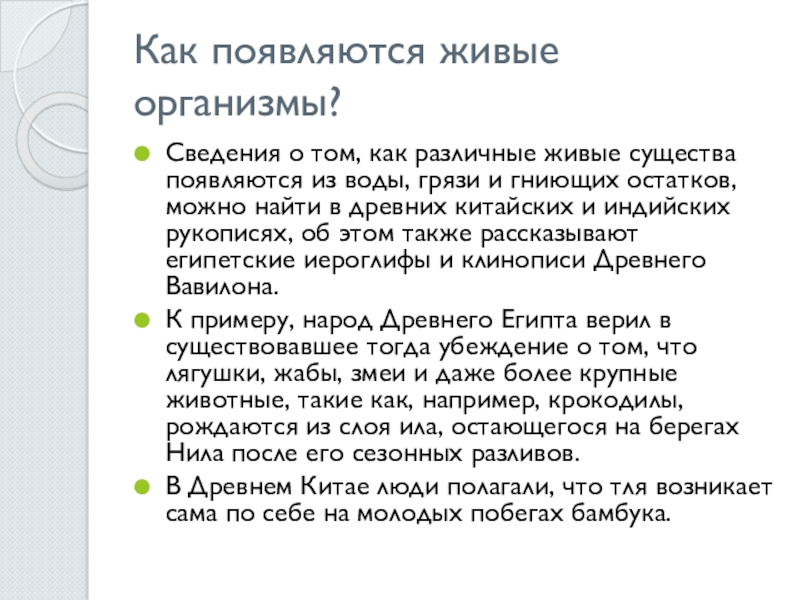 Ф. Реди брал два куска мяса, раскладывал их в глиняные горшочки. Но один он накрывал кисеёй, а другие нет. Через какое-то время он снимал кисею, но ни мух, ни их личинок в мясе не было. В то время, как в остальных они были.
