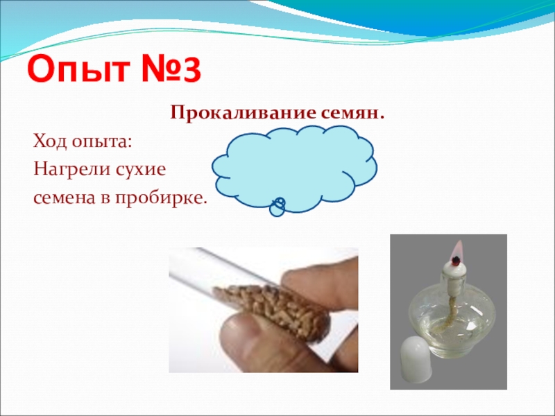 Опыт №3Прокаливание семян.Ход опыта:Нагрели сухие семена в пробирке.