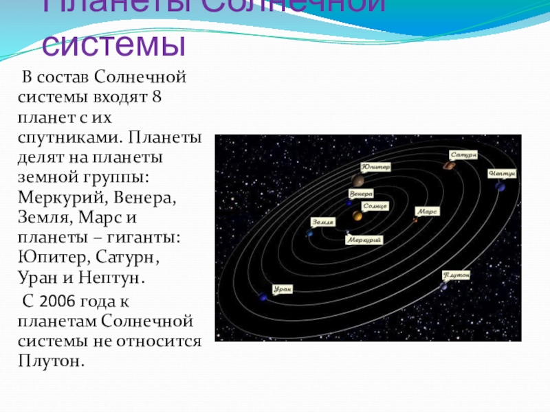 их спутниками. Планеты делят на планеты земной группы: Меркурий, Венера, Земля, Марс и планеты – гиганты: Юпитер, Сатурн, Уран и Нептун.