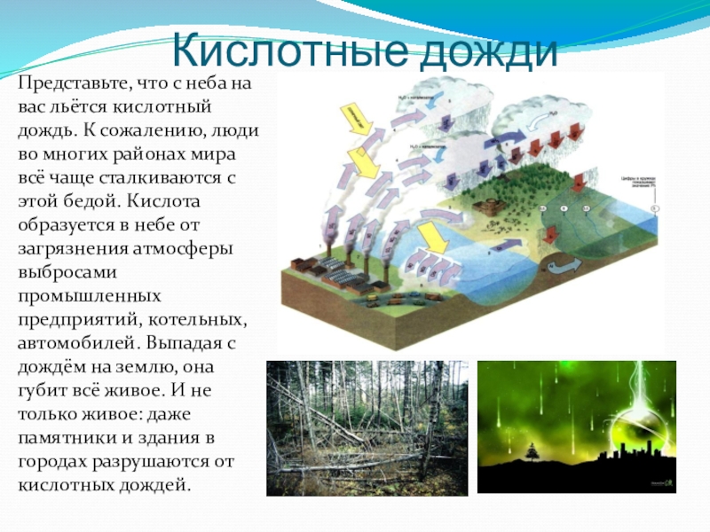 К сожалению, люди во многих районах мира всё чаще сталкиваются с этой бедой. Кислота образуется в небе от загрязнения атмосферы выбросами промышленных предприятий, котельных, автомобилей. Выпадая с дождём на землю, она губит всё живое. И не только живое: даже памятники и здания в городах разрушаются от кислотных дождей.