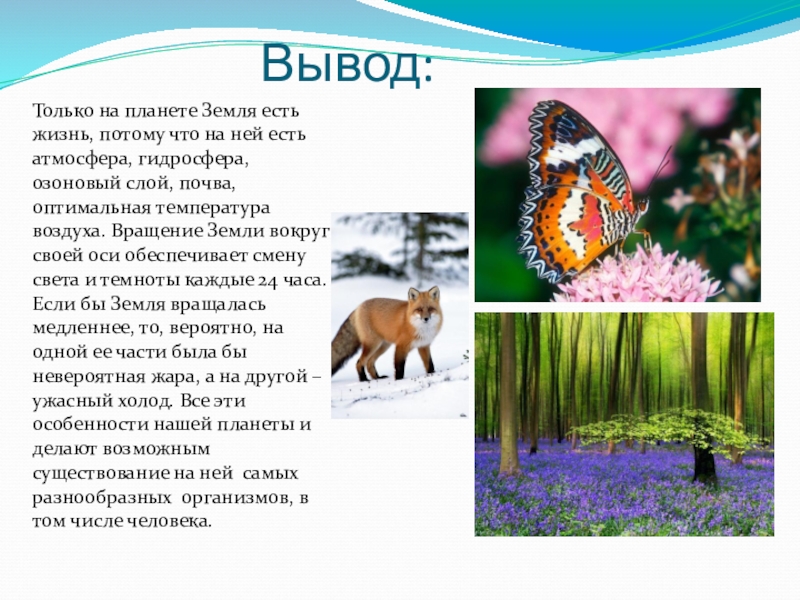 атмосфера, гидросфера, озоновый слой, почва, оптимальная температура воздуха. Вращение Земли вокруг своей оси обеспечивает смену света и темноты каждые 24 часа. Если бы Земля вращалась медленнее, то, вероятно, на одной ее части была бы невероятная жара, а на другой – ужасный холод. Все эти особенности нашей планеты и делают возможным существование на ней самых разнообразных организмов, в том числе человека.
