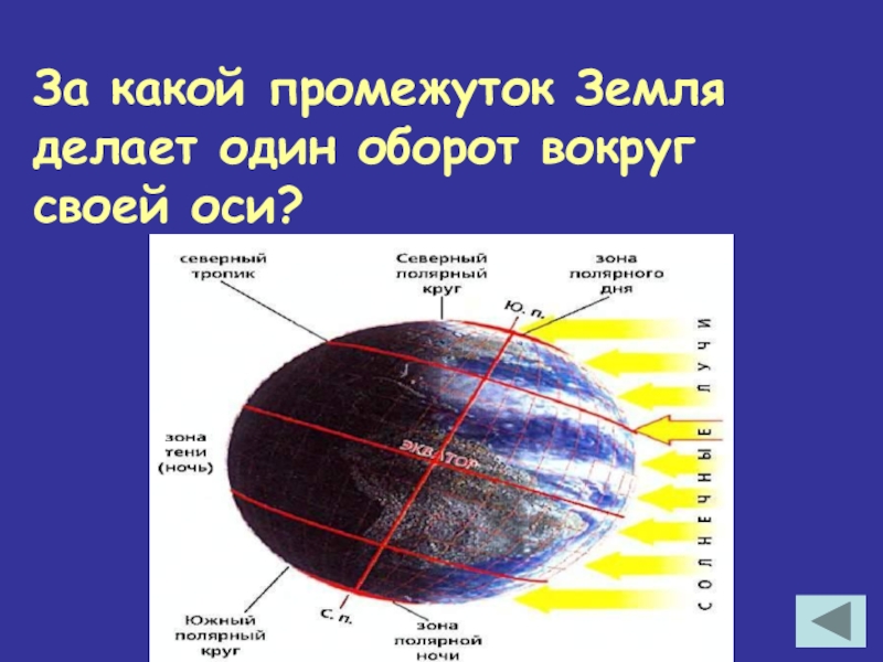 Слайд 31За какой промежуток Земля делает один оборот вокруг своей оси?