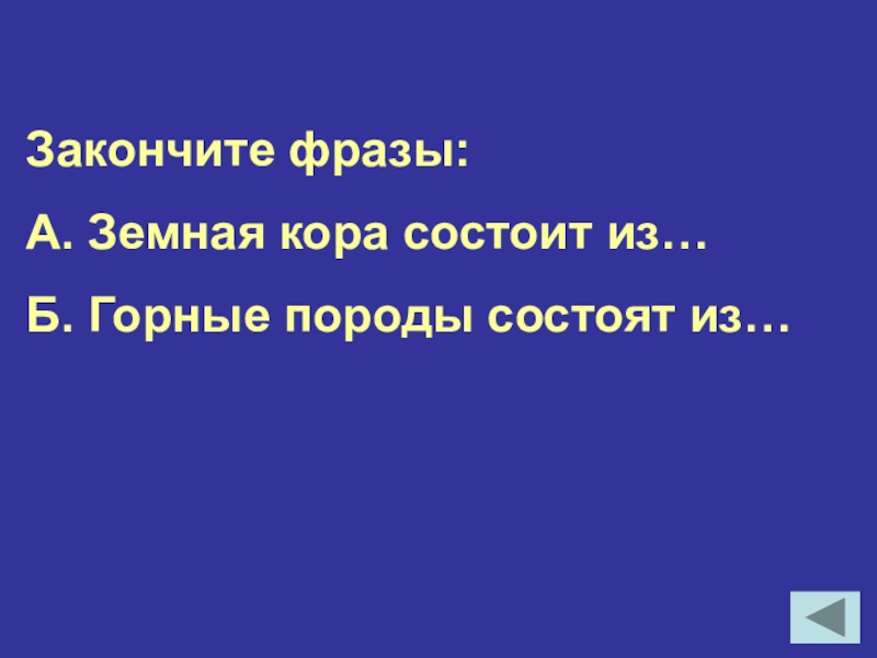 Закончите фразы:А. Земная кора состоит из…Б. Горные породы состоят из…