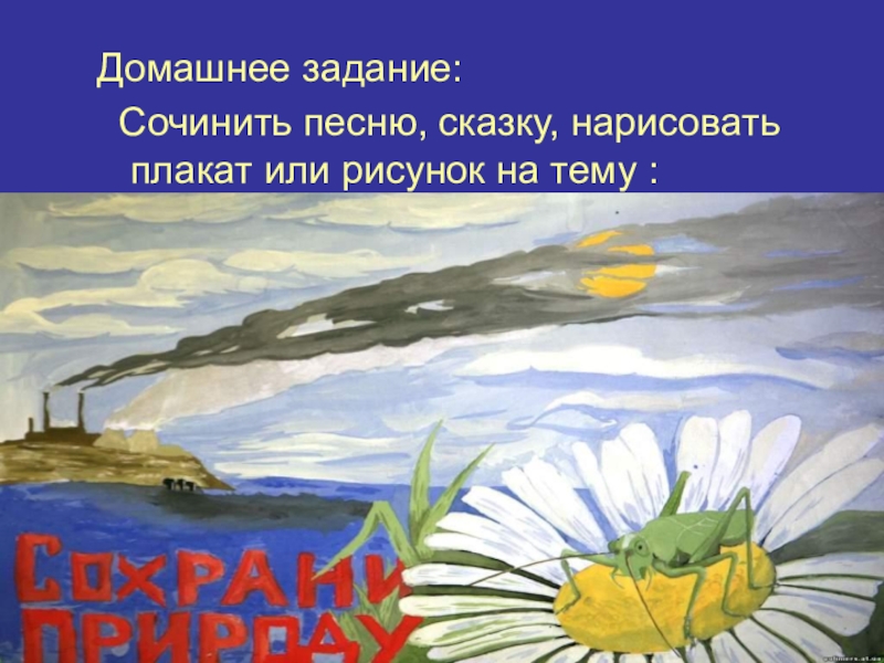 Домашнее задание:  Сочинить песню, сказку, нарисовать  плакат или рисунок на тему :
