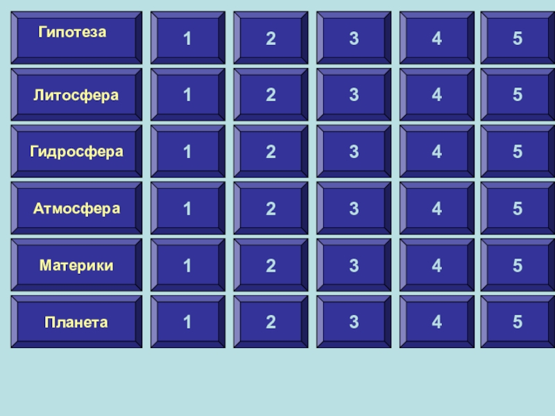 1ЛитосфераГидросфераАтмосфера МатерикиПланетаГипотеза23451234512345123451234554321