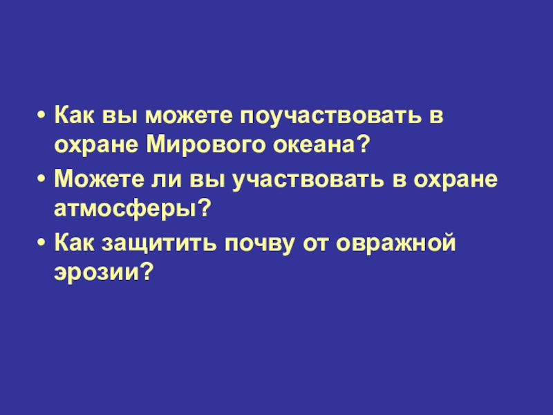 Как вы можете поучаствовать в охране Мирового океана?Можете ли вы участвовать в охране атмосферы?Как защитить почву от