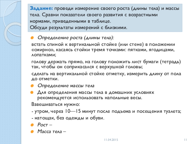 Задание: проведи измерение своего роста (длины тела) и массы тела. Сравни показатели своего развития с возрастными нормами, приведенными в таблице.