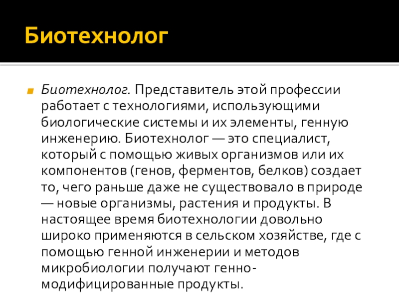 элементы, генную инженерию. Биотехнолог — это специалист, который с помощью живых организмов или их компонентов (генов, ферментов, белков) создает то, чего раньше даже не существовало в природе — новые организмы, растения и продукты. В настоящее время биотехнологии довольно широко применяются в сельском хозяйстве, где с помощью генной инженерии и методов микробиологии получают генно-модифицированные продукты.