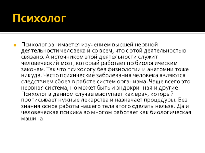 что с этой деятельностью связано. А источником этой деятельности служит человеческий мозг, который работает по биологическим законам. Так что психологу без физиологии и анатомии тоже никуда. Часто психические заболевания человека являются следствием сбоев в работе систем организма. Чаще всего это нервная система, но может быть и эндокринная и другие. Психолог в данном случае выступает как врач, который прописывает нужные лекарства и назначает процедуры. Без знания основ работы нашего тела этого сделать нельзя. Да и человеческая психика во многом работает как биологическая машина.