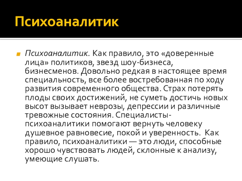 в настоящее время специальность, все более востребованная по ходу развития современного общества. Страх потерять плоды своих достижений, не суметь достичь новых высот вызывает неврозы, депрессии и различные тревожные состояния. Специалисты-психоаналитики помогают вернуть человеку душевное равновесие, покой и уверенность. Как правило, психоаналитики — это люди, способные хорошо чувствовать людей, склонные к анализу, умеющие слушать.