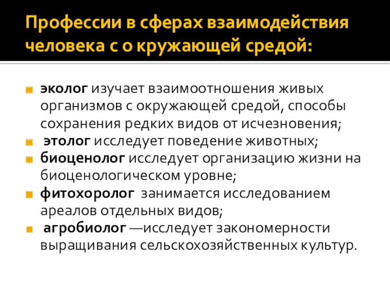 Слайд 7Профессии в сферах взаимодействия человека с о кружающей средой:
