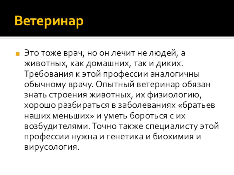 домашних, так и диких. Требования к этой профессии аналогичны обычному врачу. Опытный ветеринар обязан знать строения животных, их физиологию, хорошо разбираться в заболеваниях «братьев наших меньших» и уметь бороться с их возбудителями. Точно также специалисту этой профессии нужна и генетика и биохимия и вирусология.