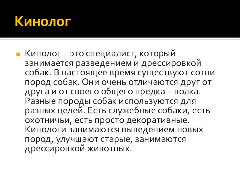 Кинолог – это специалист, который занимается разведением и дрессировкой собак. В