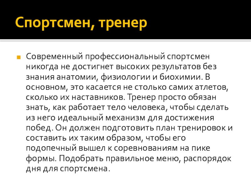 анатомии, физиологии и биохимии. В основном, это касается не столько самих атлетов, сколько их наставников. Тренер просто обязан знать, как работает тело человека, чтобы сделать из него идеальный механизм для достижения побед. Он должен подготовить план тренировок и составить их таким образом, чтобы его подопечный вышел к соревнованиям на пике формы. Подобрать правильное меню, распорядок дня для спортсмена.