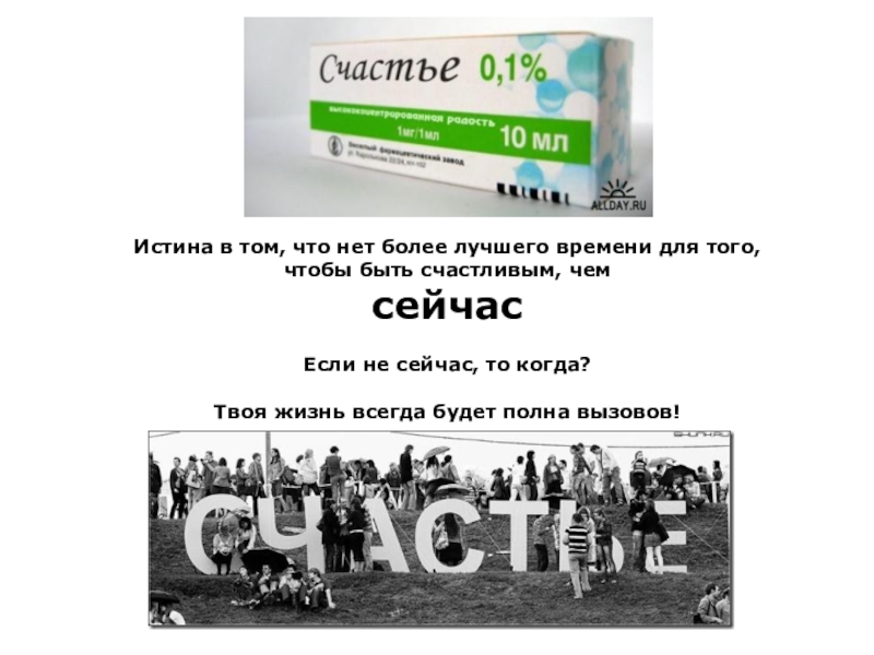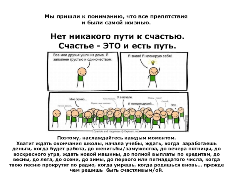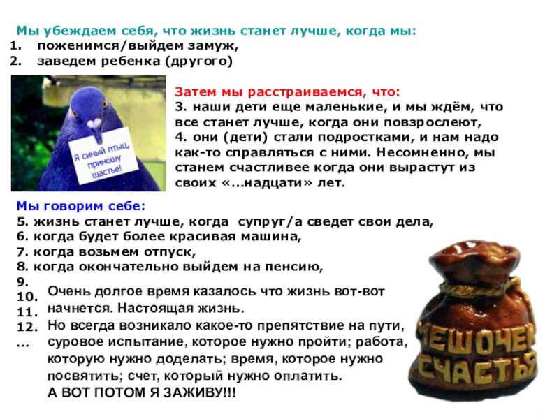 Хватит ждать окончания школы, начала учебы, ждать, когда заработаешь деньги, когда будет работа, до женитьбы/замужества, до вечера пятницы, до воскресного утра, ждать новой машины, до полной выплаты по кредитам, до весны, до лета, до осени, до зимы, до первого или пятнадцатого числа, когда твою песню прокрутят по радио, когда умрешь, когда родишься вновь… прежде чем решишь быть счастливым/ой.